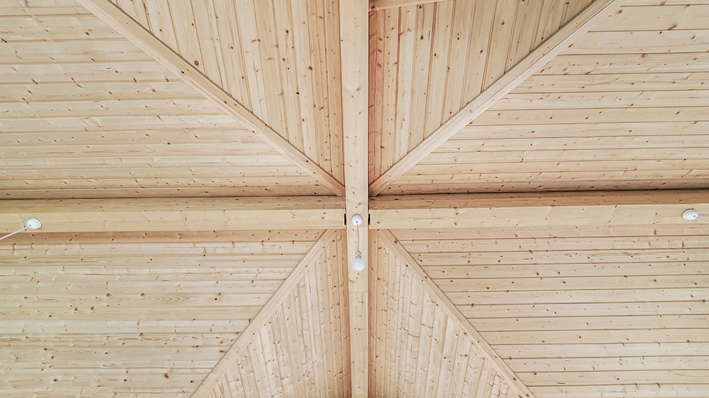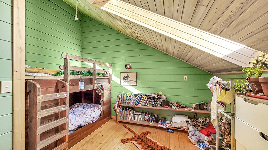 The top floor has 20mm thick tongue & groove Nordic Spruce flooring & exposed 190mm thick rafters & again, 20mm tongue & groove ceiling linings.